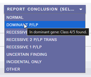 | 5 | Recessive 1 P/LP | In recessive gene: 1 Class 4/5 heterozygous variant that can explain phenotype found. Note: If variant does not fit with the patient's phenotype, consider using "Not relevant" - "Carrier P/LP (recessive)" |